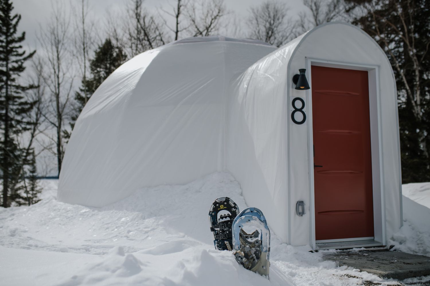 The winter scene at Station Boréale belongs in a snow globe: Shoveled pathways lead to a village of igloo-like structures with big picture windows and sun-filled skylights. The landscape is wooded and remote, and the locale is a tiny island on a lake in Western Quebec.